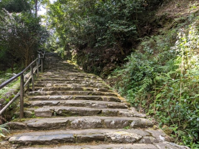 橋を渡ったあとは、長い石段が続きます。なかなかハードな道のりなので、歩きやすい靴、動きやすい服装で行くのが望ましいです。途中には、うどん・そばやかき氷を扱うお店の誘惑もあります・・・!