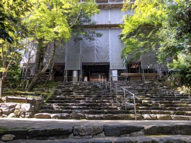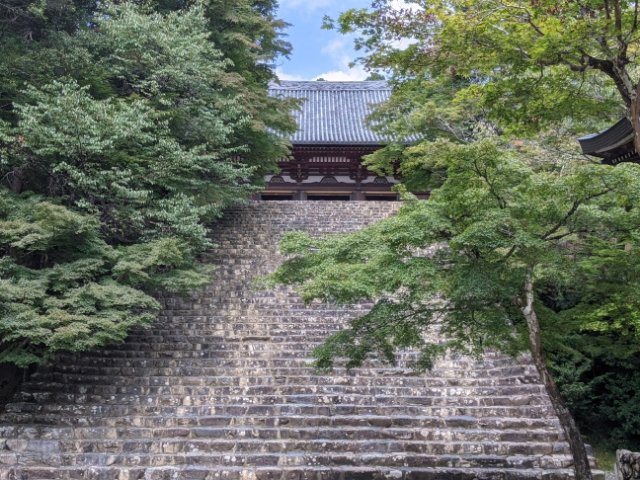 金堂へと続くそびえる石段。ゴツゴツした武骨な姿はまるで武者の鎧の草摺(くさずり=腰回りに垂れている部分)のようです。