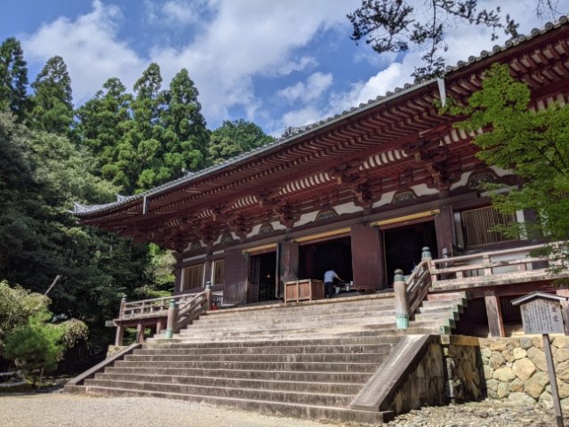 石段の向こうに建つのは金堂。重厚な歴史を感じさせる建築ですが意外と新しく、昭和10年に大阪の豪商の寄進によって建立されたお堂です。