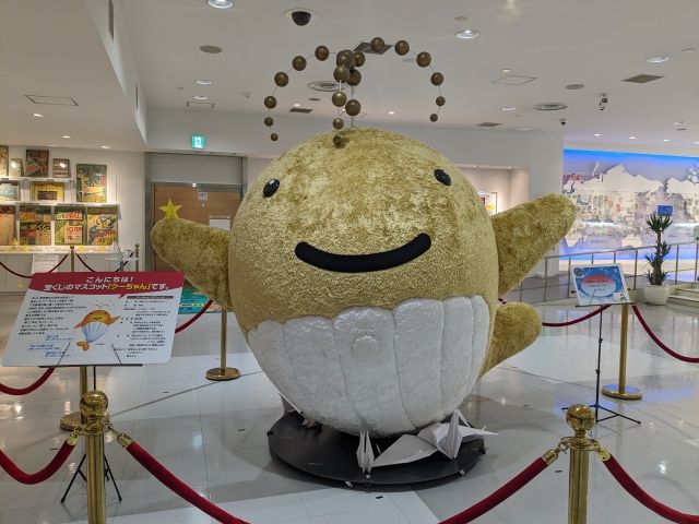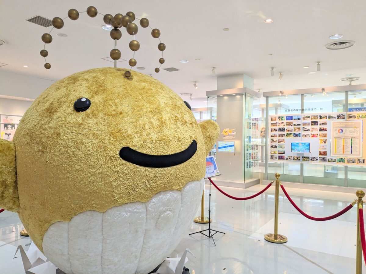 館内中央には宝くじのマスコット「クーちゃん」。宝くじ発売開始50周年を記念して誕生したキャラクターであり、頭の上の飛沫は夢と幸せを届ける姿勢を表しているそう。ちなみに性別と年齢は不明、出身地は夢の国です。