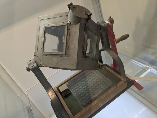 1945年に東京日本橋の三越で行われた第1回宝くじの抽せん会にて使用されたのが、この「箱型抽せん器」。ハンドルを回して番号の付いた玉を出すガラポンタイプです。