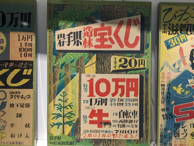 こちらは戦後復興期の宝くじの看板。物資が不足していた時代、当選者に贈られるのは現金だけではなく、別の賞品が付いていたこともありました。