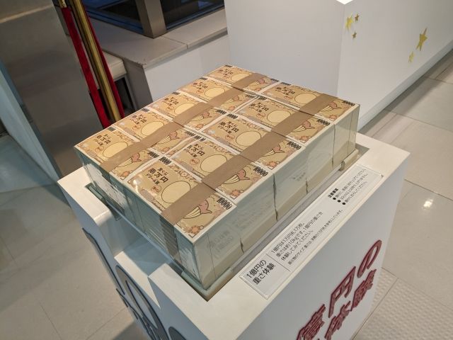 こちらは1億円の重さの体験コーナー。10,000枚の一万円札は、その重さ10kg。かなりの重さですが、なんとか一人でも持てるレベルでした。