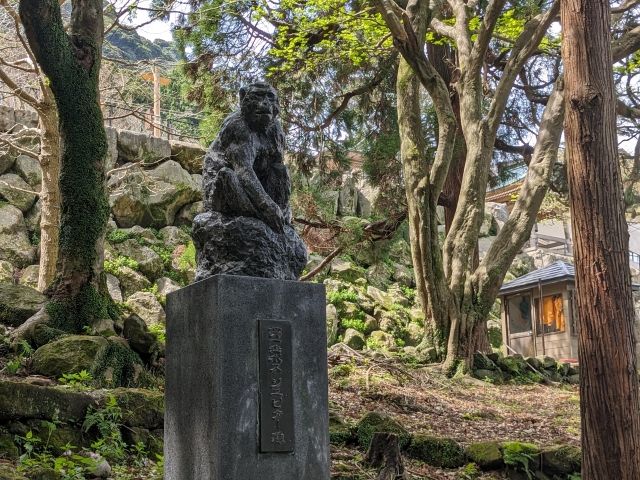 道中で見かけたサルの銅像。こちらは初代ボスザル・ジュピター像。サル寄せ当時から昭和36年1月まで君臨したボスで、郷土出身の彫塑家・朝倉文夫による作品であるそう。