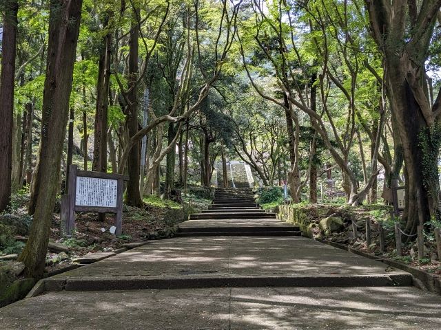 当初はモノレールに乗ろうかと思っておりましたが、5〜6分なら行ける気がしたので歩いて上ってみることにしました。木立に包まれたまっすぐな階段。迫力はありますが、段数も傾斜もそれほどハードではありません。