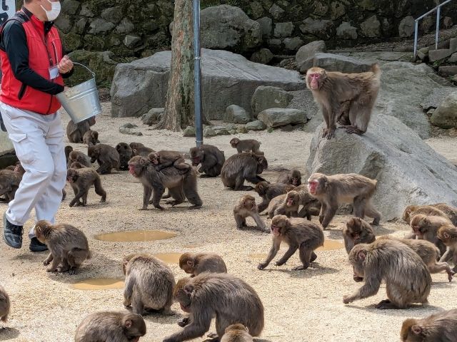 サル寄せ場では30分に一度エサやりタイムがあります。サルたちはおじさんのまわりに集まり大騒ぎ!