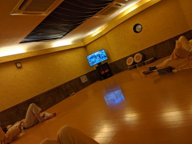 こちらは低温の温座敷。ぽかぽかとしたお部屋で、漫画を持ち込んだり、テレビを眺めてすごせる場所です。居眠りしたり、ストレッチしたりするのに良さそうな場所。もう溶けてしまいそうです。