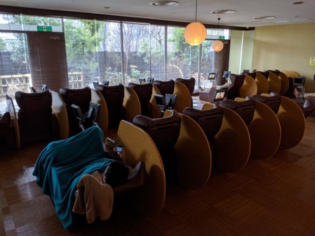 休憩スペースにはリクライニングチェアがたくさん。個別のモニターやコンセントが付いている席も複数あります。日曜日の訪問でしたが、満席になることは無く、激しい場所取り争いも皆無です。