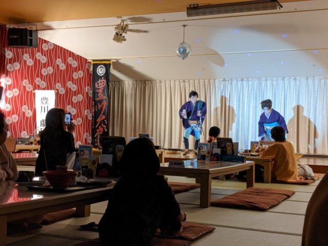 お昼ごはんを食べていたら、照明が徐々に暗くなり、舞踏がはじまりました!こういった大衆演劇ははじめて見たのですが、おひねり文化など初めて見るものが多く、とても貴重な体験でした。