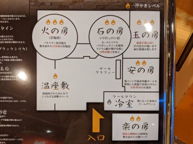 冷房がひんやりと効いた「クールダウン冷室」で冷ましたら、バドガシュタイン鉱石という凄そうな石を使用した「石の房」やパキスタン産の岩塩を使用した「火の房」など、岩盤浴はしごを楽しめました。席数が多いため、たとえ1部屋が満室になっても、どこかの部屋は空いていました。