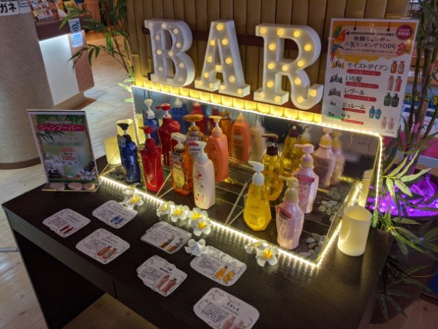 受付にはシャンプーバーもあります。1セット100円ですが、様々な種類のシャンプーを利用することができます。自宅のシャンプー変えようか悩んでいる方は、お試しするのにぴったり。