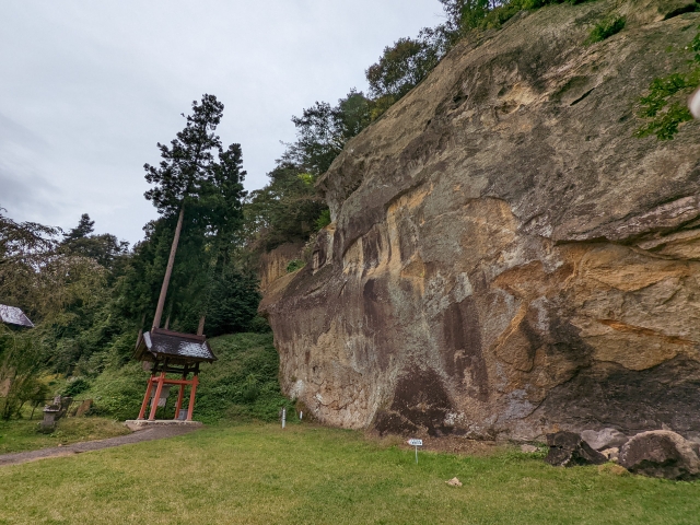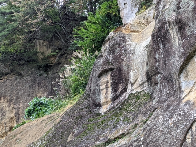 こちら、高さ16.5m・顔の大きさは3.6mにもおよぶ巨大な摩崖仏。大日如来あるいは阿弥陀如来と考えらえれており、源義家が「前九年・後三年の役」で亡くなった敵味方の諸霊を供養するために馬上より彫りつけたといわれています。