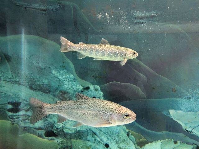 最上流の水槽は、イワナ・ヤマメ・ニジマス。大きなニジマスは、ほかの魚を追いかけたりしてます。
