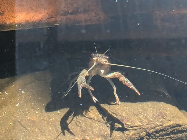 下流ではフナ、メダカ、アメリカザリガニといったなじみ深いラインナップ。ザリガニは人が近づくとハサミを掲げた威嚇のポーズを披露します。