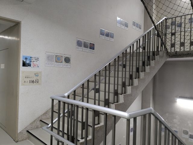 階段には日本各地のマンホールの写真が貼られています。段数は116段、がんばりまっす!