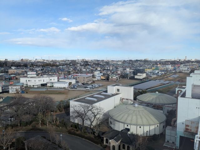 東側は汚泥処理棟、導水ポンプ所、砂濾過施設など、さまざまな施設が並んでいます。遠くには多摩都市モノレールも見えるよ。