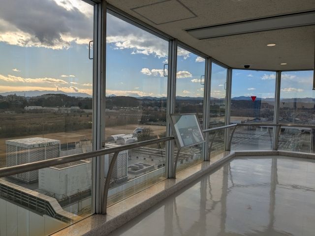 館内を見学していると、目に入ったのは「展望台の見学を希望される方は、2階事務室で記帳をお願いします」との記載。外から見たときは管制塔のような施設かと思っていた塔は、実は展望台だったのです。