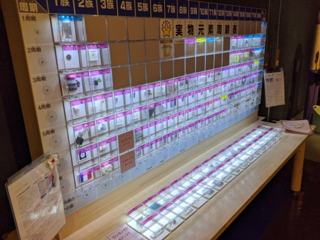 個人的に面白いなと感じたのはこちらの実物元素周期表。Li(リチウム)はリチウム電池、Na(ナトリウム)は塩、F(フッ素)は歯磨き粉といった具合でその元素が含まれているものを実際に展示している視覚効果抜群の周期表です。