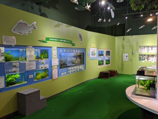 自然コーナーにはキンブナやコイなど、多摩川に住むサカナたちの水槽が並びます。実際に生きているサカナを見ることができるので、ちょっとした水族館のようです。