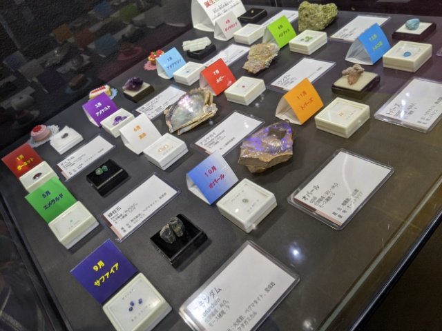 色とりどりの宝石は「誕生石」。各月の宝石が実物展示で勢ぞろい。どの石も美しく、キラリと輝きます。誕生石って色が上手くバラけていますね。