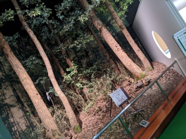 武蔵野の雑木林のジオラマ。コナラやクヌギが生い茂る森の中、よく見るとコジュケイやノウサギなどの生き物が隠れています。
