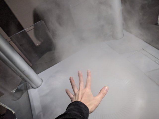 こちらは竜巻が出来上がる様子を体験できる装置。下から出る空気が天井に吸い込まれる過程でぐるぐると渦を巻きます。手を入れると竜巻が一瞬でくずれます。なんだかすごい力を手に入れたようでクセになります。