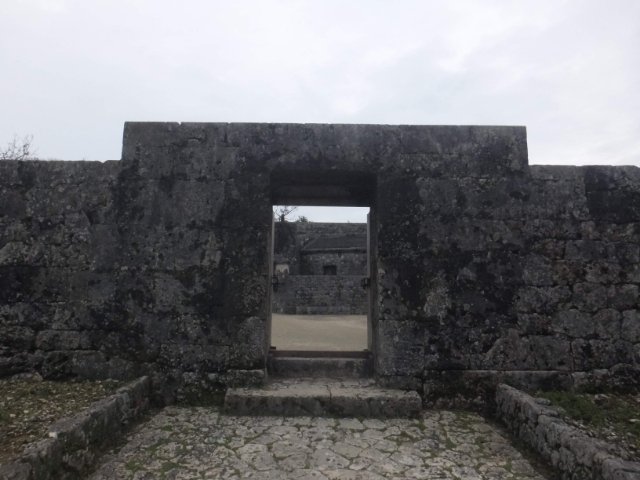 迎えるは石の門。首里城と比べると装飾もなくシンプルで小さな門ですが、古代遺跡のような雰囲気が感じ取れます。
