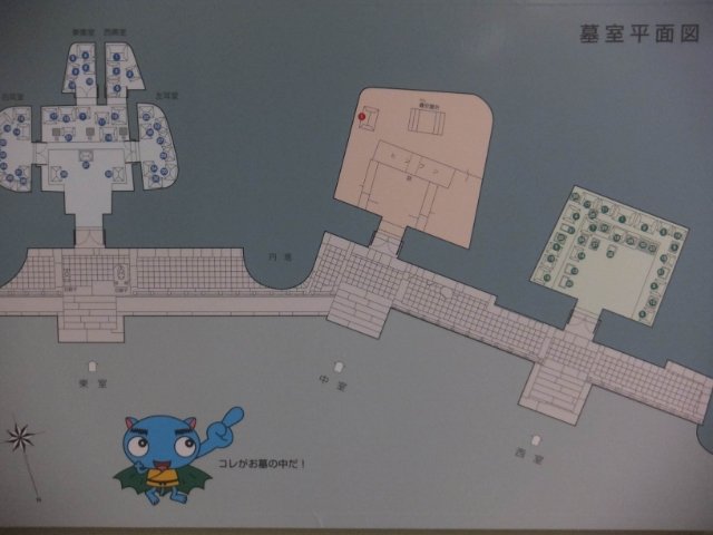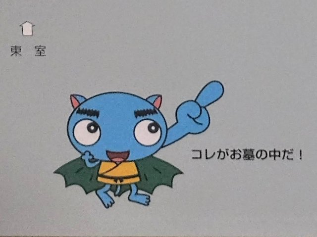 「コレがお墓の中だ!」と指さしている水色のキャラクターは、マスコットでしょうか?