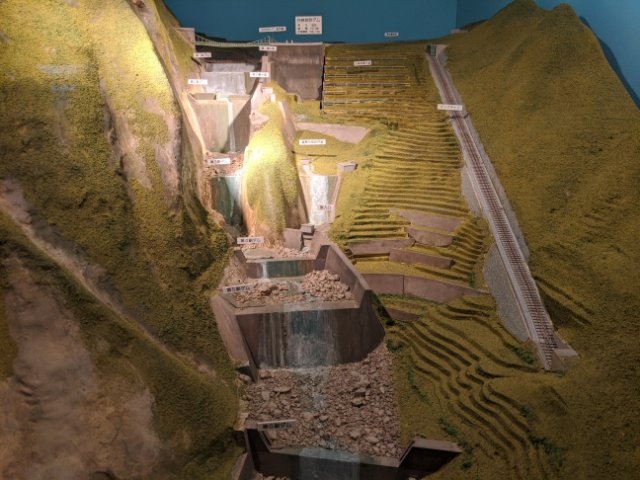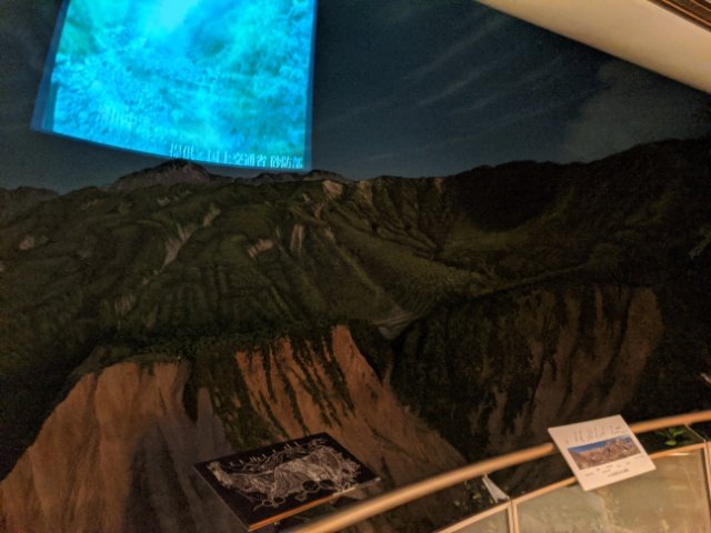 このジオラマ、スイッチを押すと映像が壁に投影されます。激しい土石流を体感できる仕掛け付きでした。