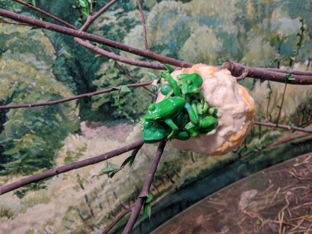 ヤマセミの横、木の枝にまとまった泡のかたまりは、モリアオガエルの卵。カエルといえば水中にゼリー状の卵を産むイメージがありますが、この種は泡状の卵を樹上に産み付けます。1匹のメスに複数のオスが集まり産卵・受精が行われます。