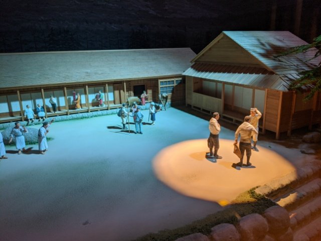 館内で見かけた昭和初期の温泉を再現した模型。話し声が流れており、登山客や湯治客で賑わっていた様子が伝わってきます。
