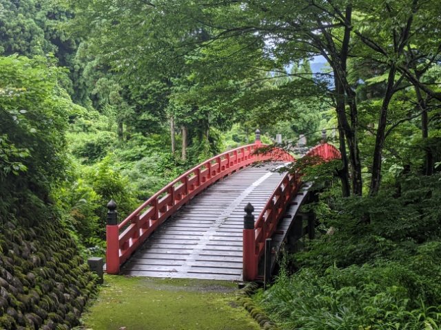 展示館サイドから向かうと、直前に真っ赤な橋が見えてきます。こちらは布橋といい、江戸時代にこの世とあの世の境目と考えられていた橋です。