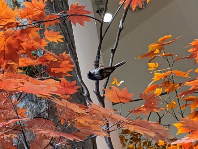 ブナの森に混ざるのは赤く紅葉したハウチワカエデ。そして、その枝に逆さにぶら下がっている鳥はエナガ。小さくて丸っこい、とてもかわいい野鳥です。