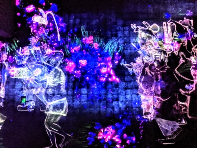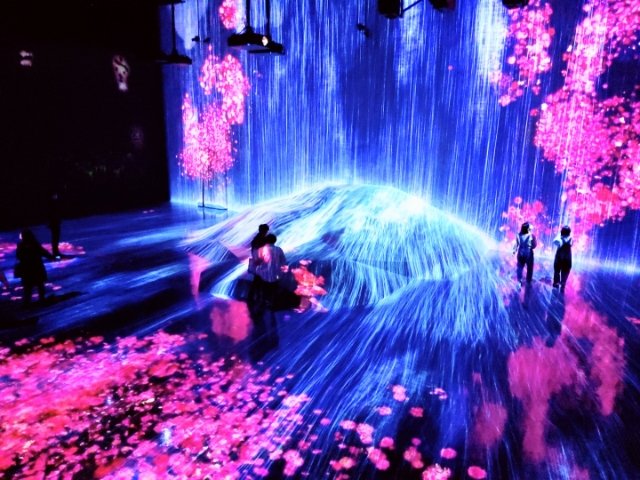 まるで滝のように流れ落ちるデジタルアートの洪水は「人々のための岩に憑依する滝」。鑑賞するだけの作品かと思いきや、人が集まるところに花が咲き、また岩の部分に立つ人に反応して水が流れるという変化も楽しめます。