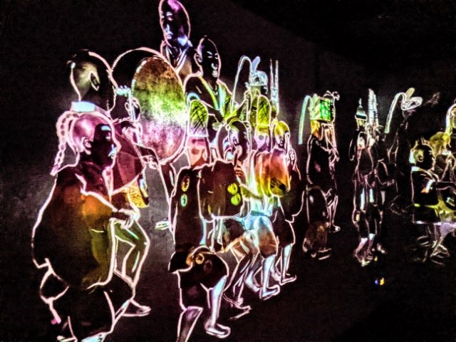 壁を行進しているのは、大名行列のような和風な御一行。太鼓や笙(しょう)の音色を鳴り響かせ、「さぁっ!さぁっ!」といった掛け声とともに進んでいきます。「移動する作品」を体現するかのように、ゆっくりと壁から壁へと移っていきます。