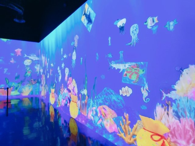 ユニークなのは「お絵かき水族館 」。実際の紙にクレヨンで塗り絵をすると、デジタル世界に取り込まれて壁や床を動き回っていきます。お子様向けかと思いきや、好きな色で塗った自分のキャラを探すのは、大人でもついつい夢中になってしまいます。