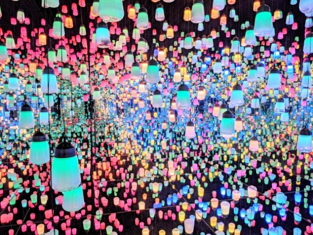 「呼応するランプの森」では、おびただしい数のランタン風ライトが吊るされています。この部屋は全方向ミラー仕様。様々なカラーバリエーションで輝くライトは無限に広がっていきます。