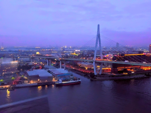 すぐに見えてくるの斜張橋は天保山大橋。天保山ハーバービレッジのある港区築港と、ユニバーサル・スタジオ・ジャパンなどがある此花区桜島をつなぐ自動車専用橋。よく見ると、橋の向こうにUSJの輝きを見ることができます。