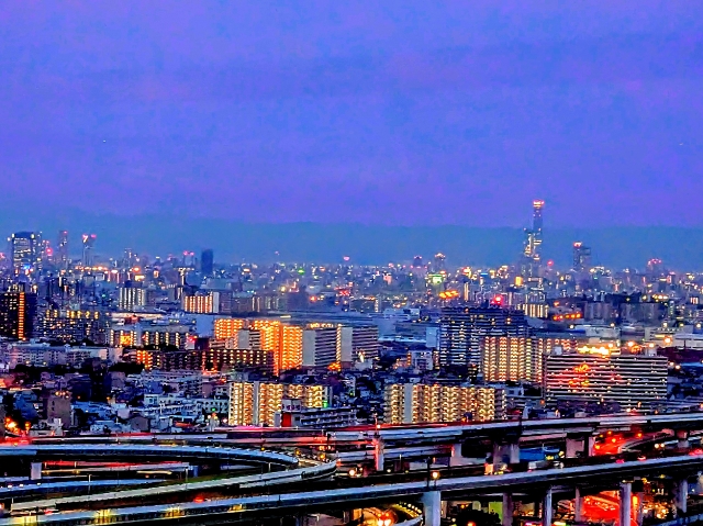 東側を見ると、市街地の向こうに圧倒的な存在感でそびえ立つあべのハルカスも見ることができます。