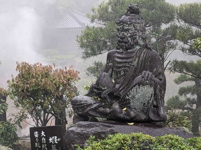 岩の上であぐらをかくような姿勢の像、こちらは「蝦蟇(がま)仙人」。青蛙神を従えて妖術を使う中国の仙人です。左手と頭の上をよく見ると、2匹のカエルがちょこんとのっかっています。