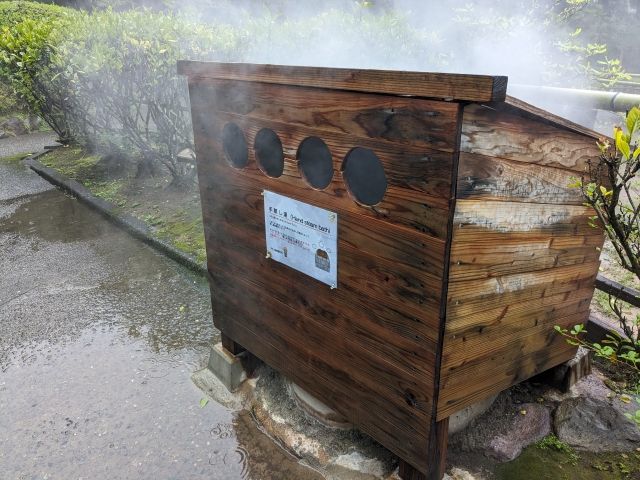 丸い穴の空いた木箱。こちらは「手蒸し湯」。手を入れて蒸し湯体験をすることができますが、火傷の恐れがあるため1分以内にするようにとのこと。時計とアクセサリーも外したほうが良さそうです。