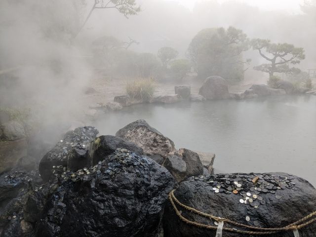 「蒸気井」と呼ばれるポイントでは、地下200mから源泉が噴き出しています。青く変色した硬貨が印象的。