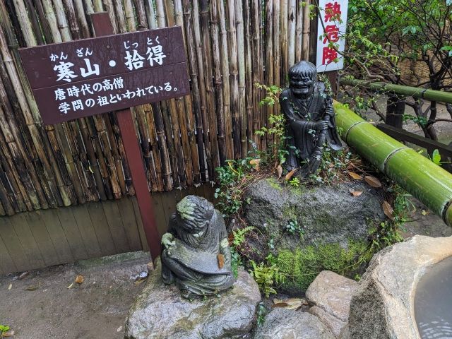 竹の樋の傍にいるのは「寒山(かんざん)」と「拾得(じっとく)」という唐時代の高僧。学問の祖ともいわれており、ホウキを持つ姿と巻き物を読む姿が印象的です。