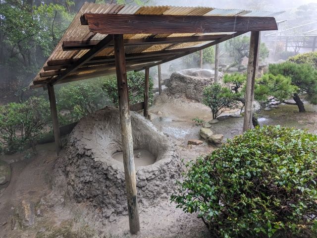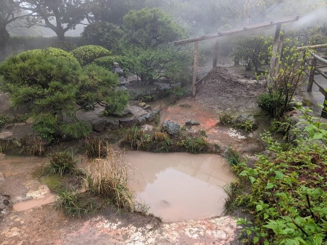 園内のあちらこちらに赤い粘土層の窪みがありますが、ここはもともと坊主地獄であった「坊主地獄跡」。時代によって吹き出す場所が変わっているため、このような跡が多数点在しているのです。