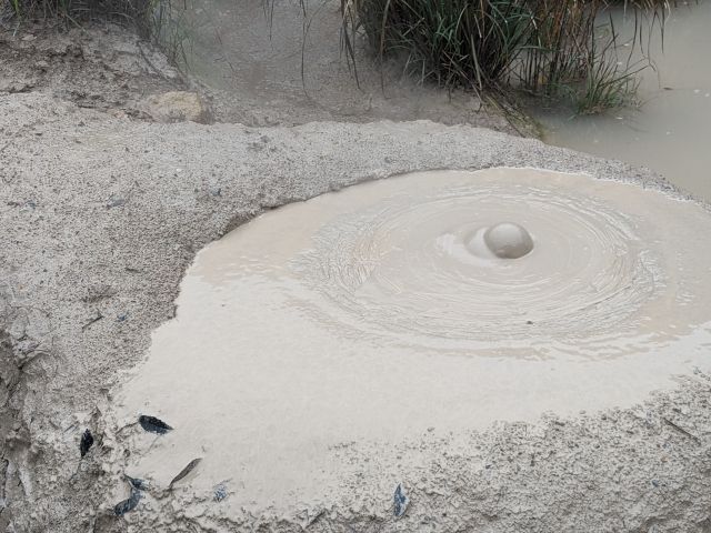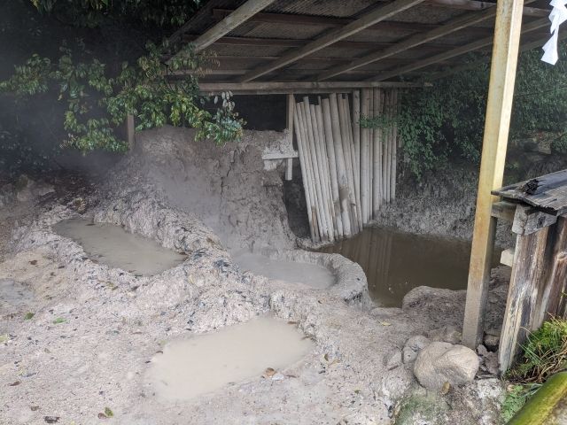 平成元年に熱泥が噴出した、一番新しく勢いのある坊主地獄「平成泥火山口」。最も若い坊主ということになりますが、粘度が低いのか丸い坊主姿にはなっておりませんでした。