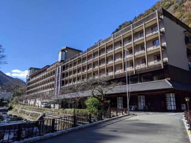 箱根湯本駅から徒歩12分ほど。片道100円のシャトルバスも出ていますが、須雲川沿いの温泉街を歩いて行くのも楽しいですよ!
