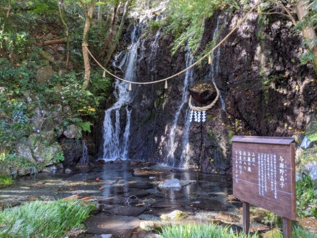 庭園には2つの滝があります。1つ目は玉簾(たまだれ)の瀧。高さ約8m・幅約11mの立派な滝で、ザーザーと音を立てて勢いよく流れています。木の間と岩に掛けられた注連縄が神聖な雰囲気です。