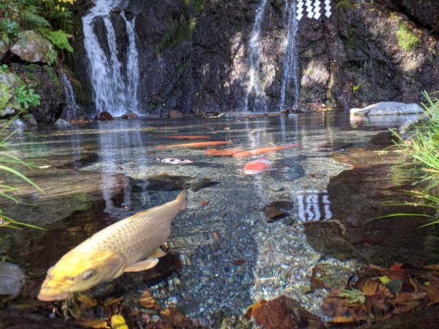 滝壺にはニシキゴイがたくさん。水がとってもキレイで、カラフルな鯉がめっちゃ映えます。