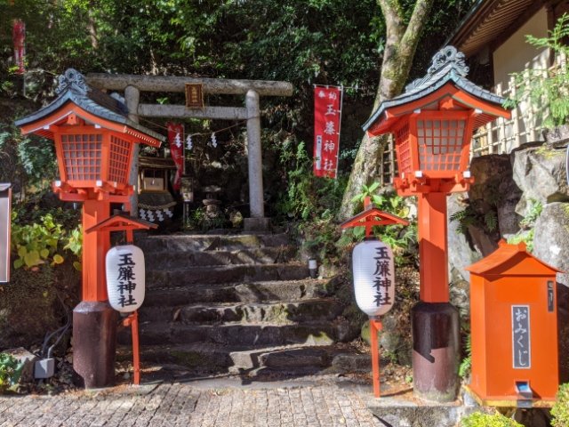 園内にて箱根大神を祀る玉簾神社。江戸時代に稲葉氏の邸内社として創建されたといわれる神社で、105段の石段を登った先に社殿があります。