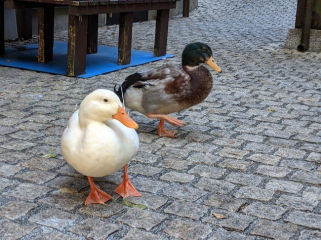 池にはニシキゴイに加えて真っ白なアヒルとアオクビアヒルがたくさん!グワッグワッと鳴きながら泳いでいるのでとってもにぎやかです。